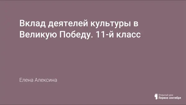 Урок проводится в форме устного журнала с технологией проблемного обучения. Урок рассматривает особенности развития музыки, живописи, литературы, кинематографа в условиях Великой Отечественной войны; показывает на примерах, какой вклад в Победу внесли деятели культуры; развивает умение анализировать, обобщать, делать выводы; формирует чувство патриотизма.