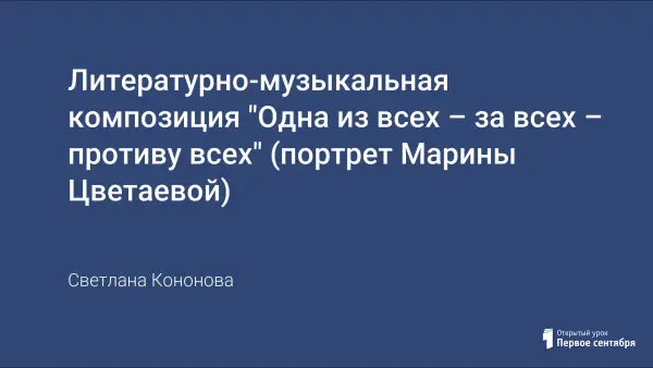 Литературно-музыкальная гостиная "Одна из всех - за всех - противу всех". (Портрет Марины Цветаевой)" представляет собой вариант проведения вводного урока по творчеству Марины Цветаевой в 11-м классе. Она составлена на основе биографических материалов, эссе "Мой Пушкин" и воспоминаний сестры поэтессы – Анастасии Цветаевой. Материал позволяет проследить все этапы жизни Марины Ивановны и ее становление как поэта. Композиция может сопровождаться компьютерной презентацией.