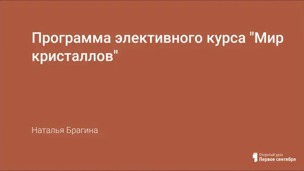 Предлагаемый Элективный курс рассчитан на 14 часов. Курс не дублирует школьную программу, а расширяет и углубляет знания по физике и химии. Он предназначен для учащихся 9-х классов. Цель данного курса - содействовать самоопределению учащихся в выборе дальнейшего профиля обучения в старшей школе и к углубленному восприятию материала. Практическим результатом курса может быть выход на творческий экзамен в рамках школы, создание проекта "Мир кристаллов", web-страницы по материалам курса, печатного путеводителя по кристаллам.