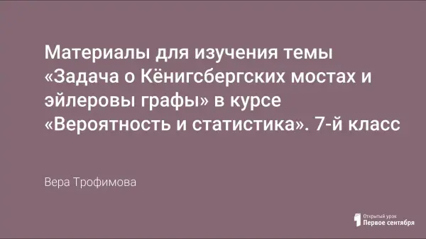 В этом учебном году в учебном плане семиклассников появился новый предмет – «Вероятность и статистика». В структуре программы учебного курса «Вероятность и статистика» (7-й класс) выделено четыре содержательно-методических линий: «Представление данных и описательная статистика», «Вероятность», «Элементы комбинаторики», «Введение в теорию графов». На изучение последней из этих линий отведено 4 часа. Предлагаю вашему вниманию материалы для изучения данной темы. Предложенный материал «разбить» на уроки можно по-разному, я представляю его одним блоком.