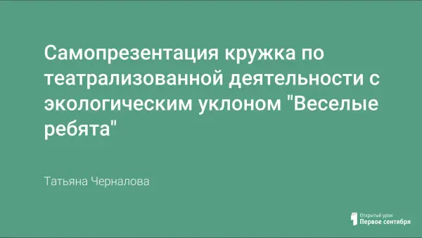 Целенаправленное и планомерное воспитание детей в духе бережного отношения к природе, её экологической чистоте. Это уже 3-й состав кружка по театрализованной деятельности с экологической направленностью в нашей прогимназии. Специфика нашего учреждения такова, что из д/с дети переходят в 1-й класс школы в этом же здании и учатся здесь 4 года, а затем всем классом переходят в лицей нашего города. Поэтому все 4 года мы занимаемся в этом кружке. Обычно это 12–14 человек из 25 учеников. Вот с этим третьим составом и решила провести презентацию кружка, а цели и задачи, какие я ставлю перед детьми, можно узнать из текста презентации.