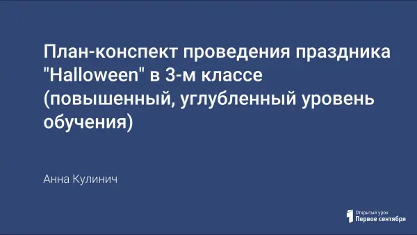 Праздник по теме "Halloween" проходил в третьем классе. С помощью этого урока хотелось не просто познакомить учащихся с традициями и обычаями англоговорящих стран, а провести настоящий праздник радости, веселья, озорства. Хотелось погрузить детей в мир необычайных звуков, песен, которые они готовы петь каждый день. Маленькое театральное представление на уроке помогло детям действительно погрузиться в мир сказки.