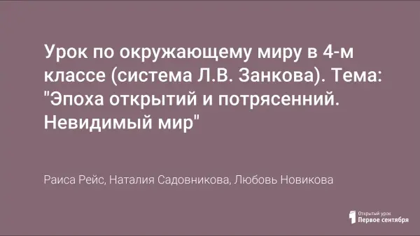 Представлен конспект урока окружающего мира по теме: "Эпоха открытий и потрясений. Невидимый мир" (по система Л.В. Занкова), в 4-м классе. Этот урок-поиск по окружающему миру - находка для тех, кто любит отыскивать ключ к разгадке. Урок поможет узнать, как развивалось человечество, какой ценой добывались знания, позволит заглянуть в невидимый мир микробов. Урок развивающего обучения формирует умение планировать и анализировать свою работу, развивать критическое и логическое мышление, речь, память, воображение. Урок проводится в форме групповой работы юных исследователей.