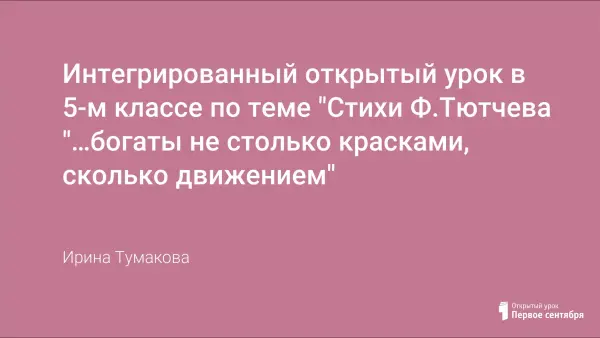 Интегрированный урок русского языка, литературы, изобразительного искусства в 5-м классе с использованием мультимедийного проектора; главная цель — на материале стихотворения Ф.Тютчева повторить орфограммы глагола. На уроке учащиеся анализируют стихотворение Тютчева, знакомятся с картинами художников, чьи работы посвящены приходу весны. В конце урока выполняют творческое задание – синквейн.