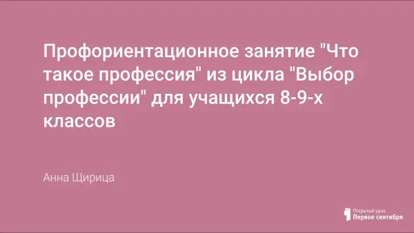 Актуализации процесса профессионального самоопределения учащихся благодаря получению знаний о себе и о мире профессий; оказанию эффективной психолого-педагогической поддержки учащимся 8–9-х классов; формированию мотивов саморазвития, личностного роста и повышению уровня психологической компетенции учащихся, посвящён цикл занятий "Выбор профессии".
