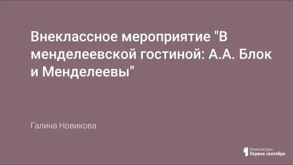 Целью встречи в гостиной является приобщение учащихся к русской истории и культуре начала XX века, пробуждение познавательного интереса к выдающимся деятелям науки и литературы. В работе представлен сценарий "гостиной" для старшеклассников, посвященный вечным человеческим ценностям, которые символизируют отношение к женщине, матери, Родине как выражение сокровенного, нравственно чистого, гуманного. В основе лежит история взаимоотношений А.Блока и Л.Д. Менделеевой, вошедшей в историю под именем Прекрасной Дамы.