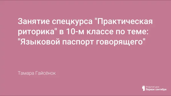 Вниманию читателей предлагается разработка занятий спецкурса "Практическая риторика" по теме "Языковый паспорт говорящего". Приведены интересные содержательные материалы, позволяющие активизировать мыслительную и речевую активность учащихся, побуждающие к высказыванию собственной точки зрения, обмену мнениями в группе, в классе. Урок носит воспитательный характер, способствует установлению доброжелательных, доверительных отношений между ребятами, ребятами и учителем.