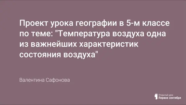 Проект урока географии в 5-м классе по теме "Температура воздуха" построен на краеведческом материале. Изучаемый материал интегрируется за 5-й класс по системе Л.В. Занкова автора М.А. Кононова и за 6-й класс общеобразовательной школы Т.П. Герасимовой. В урок включены занимательные материалы творческого характера, требующие логического мышления учащихся, умения делать выводы и объяснять, почему так, а не иначе с учетом возрастных особенностей.