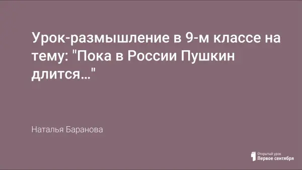 Сегодняшним девятиклассникам бывает очень непросто понять и принять некоторые идеи великого Пушкина. Урок-размышление по литературе в 9-м классе "Пока в России Пушкин длится..." подводит ребят к признанию Пушкина - поэта и человека - своим современником, к пониманию того, что к автору "Евгения Онегина" можно всегда прийти за поддержкой, за советом, за мудростью. Анализируя пушкинские строки, учащиеся приходят к выводу: и сегодня, как никогда, востребован Пророк, который должен жечь наши сердца словом, чтобы люди помнили о человеческом в человеке.