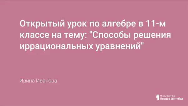 Обобщающий урок в 11-м классе. На уроке рассматривались разные способы решения иррациональных уравнений, выявлялась способность учеников сопоставить уравнению его способ решения, выбирать наиболее рациональные способы решения. Применялись различные методы и формы работы, ИКТ для более рационального использования времени.