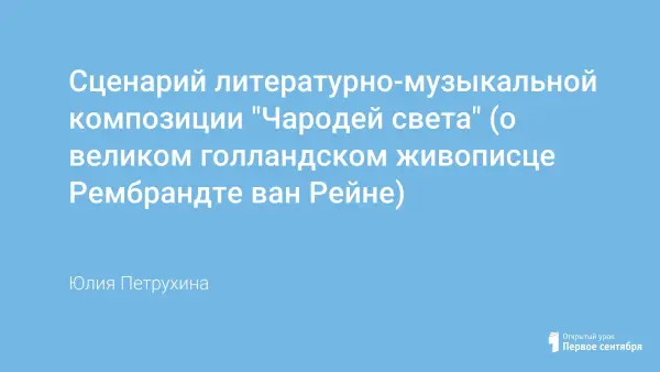 В статье предлагается сценарий внеклассного мероприятия по МХК для старшеклассников. Целесообразно участие в спектакле учеников 10–11-х классов. Текста для заучивания наизусть исполнителями в сценарии немного, сложного реквизита не требуется, репетировать можно отдельными сценами, что делает сценарий доступным для постановки на школьной сцене. Личность Рембрандта всегда интересует ребят, творчество берет за душу. Использование текста поэмы Д.Кедрина делает постановку эмоциональной, знакомит ребят с творчеством этого поэта.