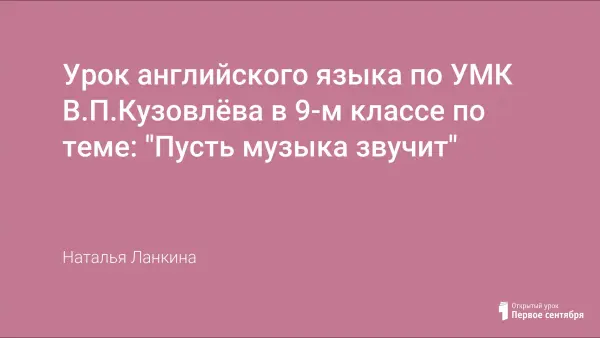 Урок английского языка, в ходе которого учащиеся знакомятся с музыкальной жизнью страны изучаемого языка путем получения знаний о стране изучаемого языка, о своей стране и о себе; развивают готовность к решению усложняющихся речемыслительных задач, требующих интеллектуальных, поисковых усилий; воспитывают в себе уважительное, толерантное отношение к другой культуре, более глубокое осознание своей родной культуры, осознание огромного значения музыки в жизни человека.