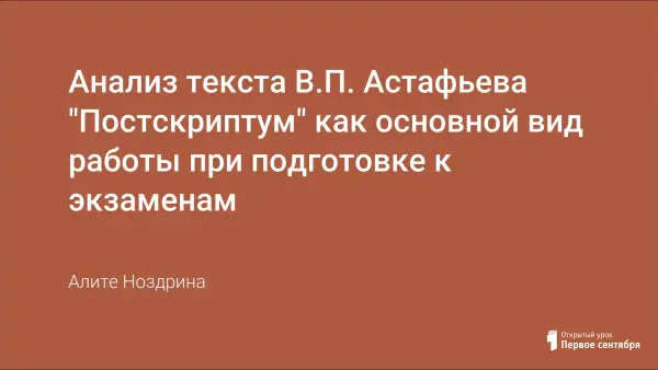 Урок "Анализ текста В.П. Астафьева "Постскриптум" как основной вид работы при подготовке к экзаменам", рассчитан на двухчасовую работу с текстами разных авторов и является продолжением занятий, направленных на осмысление авторского замысла, определение темы, идеи, стиля, жанра, языковых средств выразительности, на вычленение типологической структуры текста, на формирование умений озаглавливать предложенную прозаическую миниатюру.
