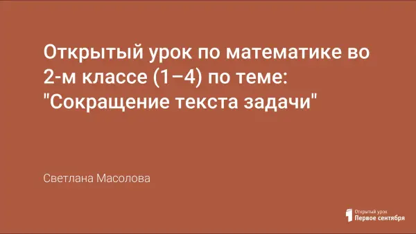 На этом уроке я работала сразу над несколькими темами программы, хотя ведущей была намечена тема "Сокращение текста задачи". Работа с основным заданием занимала большую часть времени на уроке. Параллельно с основным заданием на уроке мы закрепляли математические термины: верные и неверные равенства и неравенства, уравнения, математические записи, отрабатывали вычислительные навыки.