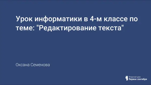 Автор предлагает вниманию коллег урок информатики в 4-м классе. Тема урока: Редактирование текста. В данном классе информатика преподается второй год, по одному уроку в неделю. Главная задача урока: развитие практических навыков работы с клавиатурой.