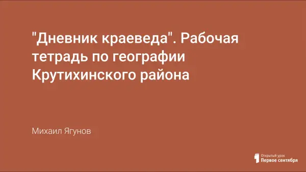 Воспитание любви к Родине начинается с воспитания любви к своей малой родине, тому месту на Земле, где ты родился, живешь и работаешь. Предлагаемая вашему вниманию рабочая тетрадь по географии Крутихинского района помогает глубже познать природу родного края. Выполняя несложные задания, используя учебное пособие "География Крутихинского района" и атлас "Люби и знай свой край", дети сердцем прикасаются к этому тихому и скромному уголку нашей Родины, и он становится им ближе и дороже.