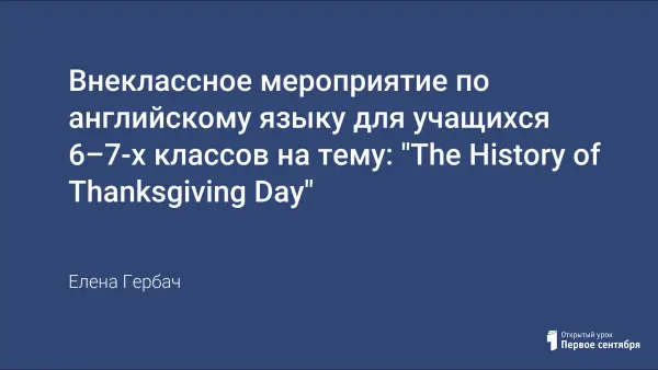 В данной статье представлен сценарий внеклассного мероприятия по английскому языку для учащихся 6–7-х классов на тему «Happy Thanksgiving Day». Сценарий был составлен на основе художественного произведения из книги «The Story of The Pilgrims» by Katherine Ross с использованием других аутентичных материалов. Урок-праздник по данной теме можно провести в рамках факультативного занятия по английскому языку в 6–7-х классах.
