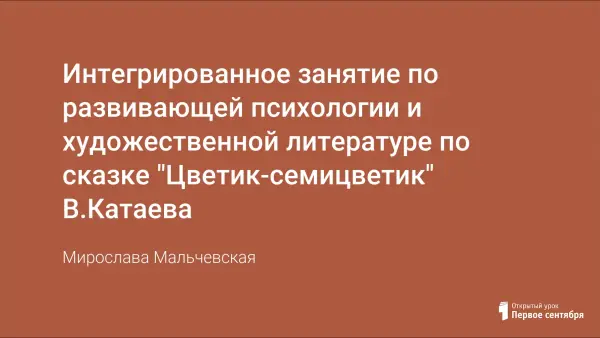 Занятия, проводимые на основе сюжета сказки, в «сказочной атмосфере», вызывают у детей интерес, радость, стимулируют воображение, импровизацию, эмоциональное внимание. В работе со сказкой часто используются приемы психогимнастики. Использование элементов психогимнастики помогает детям преодолевать барьеры в общении. В этой статье представлен конспект интегрированного занятия на основе художественного произведения «Цветик- семицветик» В. Катаева, с элементами психогимнастики.