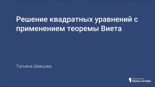 Цель урока: обеспечить закрепление теоремы Виета, обратить внимание обучающихся на решение квадратных уравнений; развивать навыки устного решения таких уравнений. Воспитательные задачи урока: способствовать выработке у школьников умения обобщать изучаемые факты; развивать самостоятельность путем составления ими уравнения.