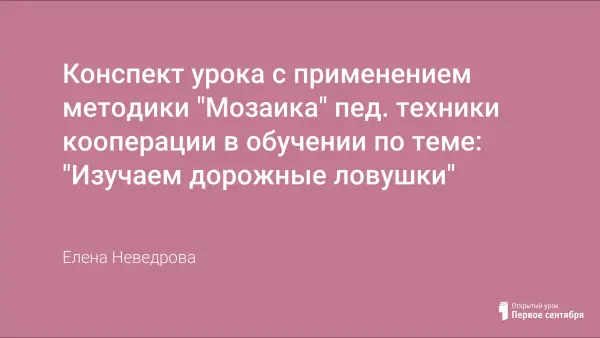 В работе представлено занятие по ПДД по изучению дорожных "ловушек" с применением методики "Мозаика" пед. техники кооперации в обучении.