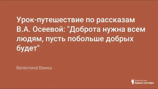 Открытый урок-путешествие по рассказам В.А. Осеевой: «Доброта нужна всем людям, пусть побольше добрых будет» (5-м класс). Задачами урока являются: формирование и развитие положительных качеств личности на уроках чтения в специальной (коррекционной) школе-интернате VIII вида; развитие умений выделять положительные черты характера действующих лиц, экспрессивной и импрессивной стороны речи.