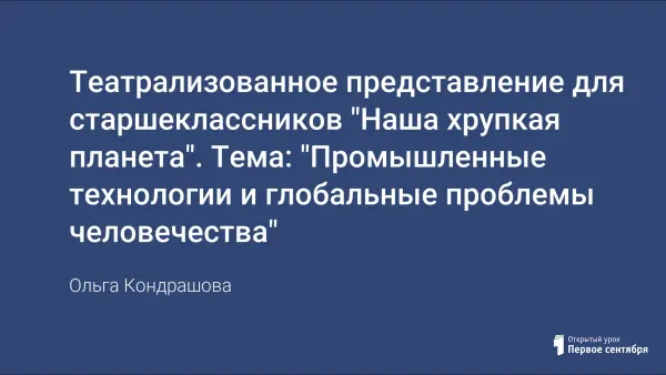 Разработка предлагает вариант проведения урока технологии для учащихся 8–11-х классов в форме театрализованного представления. В ходе представления происходит осмысление учащимися таких понятий, как «экологическая мораль», «экологическое сознание» в техногенном мире, для которых характерны: стремление к балансу во взаимодействии человека с окружающей средой, готовность сохранять и защищать природу.