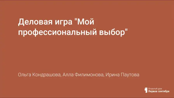 Разработка предлагает групповую работу, в ходе которой учащиеся актуализируют свои знания о мире профессий, научатся анализировать содержание деятельности профессии, а также приобретут навыки планирования своего профессионального будущего. В работе использованы приёмы, позволяющие повысить эффективность результата заданной проблемы.