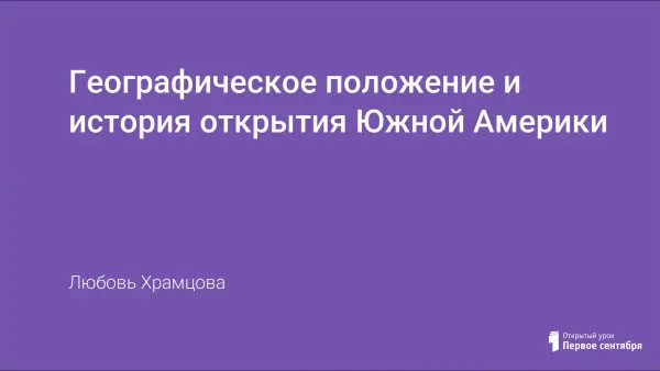 Первый урок по теме "Южная Америка" для 7-го класса. Учащиеся уже умеют определять географическое положение материка. На данном уроке они закрепляют это умение. Работая в группах, ребята совершают "путешествие" вокруг материка Южная Америка и собирают сведения о главных особенностях природы материка. Под руководством учителя пытаются делать выводы о влиянии географического положения на разнообразие природы материка. Знакомятся с историей открытия Южной Америки.