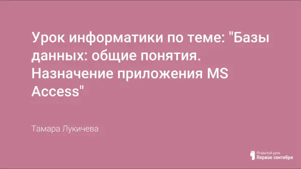 Урок- лекция по теме: "Базы данных: общие понятия. Назначение приложения MS Access" содержит большой теоретический материал, при изложении которого используется две презентации. Урок предназначен для учащихся 10-11 классов.