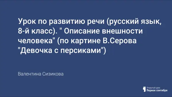 Урок является подготовкой к сочинению. Цель его: отработать умение учащихся через описание внешности человека видеть его суть, характер, настроение. Картины художника В.Серова наглядно позволяют осуществить эту цель.