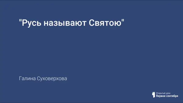 Данный урок входит в курс "История религий" и призван познакомить учащихся с понятием "Русь Святая", показать причины ее возникновения, дать не только содержательный аспект этой проблемы, но и выразить эмоциональное отношение к ней, что, на наш взгляд, достигается органичным введением в канву урока поэтических и музыкальных текстов, а также музыкальных фрагментов, используемых в качестве фона при чтении прозаических отрывков и поэтических текстов.