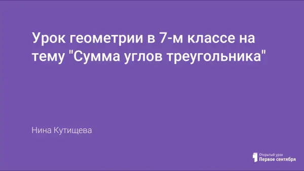 В статье предоставлен план-конспект урока геометрии в 7-м классе по теме «Сумма углов треугольника», в приложении – презентация урока, выполненная в программе PowerPoint.