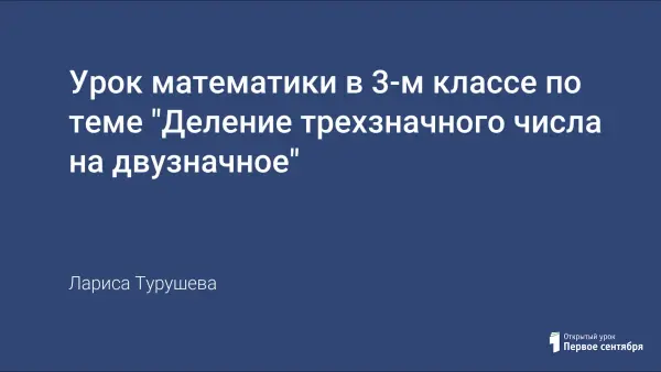 На уроке учащиеся 3-го класса знакомятся с приёмом деления трёхзначного числа на двузначное, закрепляют умения умножать на трёхзначное число, делить на однозначное число. В ходе урока формируются навыки в решении задач на нахождение дроби числа, периметра квадрата, площади прямоугольника, идёт развитие навыков счёта, логического мышления, пространственного воображения, отработка математической терминологии.
