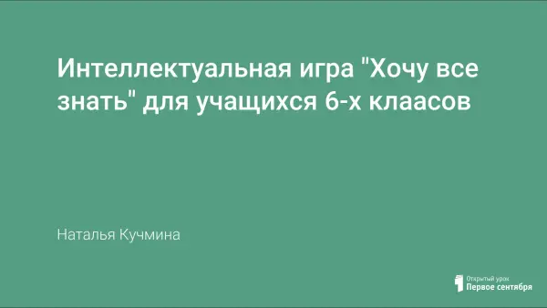 Игра "Хочу все знать" рассчитана на учащихся 6-х классов, предназначена для внеклассной работы с применением информационных технологий. Игра способствует развитию логического мышления, развитию познавательных интересов, раскрытию индивидуальных способностей учащихся. Игра требует знаний по математике, информатике, литературе, природоведению, окружающему миру и биологии.