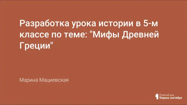 Урок в 5-м классе по теме «Мифы Древней Греции» проводится как урок закрепления знаний и совершенствования умений и навыков. Целью данного урока является повторение, обобщение и систематизация знаний по теме «Древняя Греция». Описание данного урока приводится в традиционной форме, но также этот материал можно использовать и для проведения нестандартного урока: игры, соревнования, аукциона знаний и т. п.