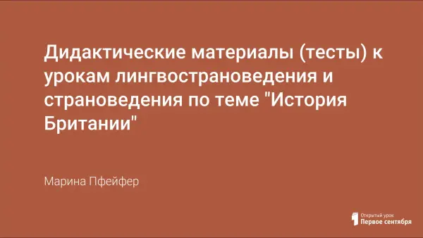 Дидактические материалы разработаны к урокам лингвострановедения и страноведения на отделении иностранных языков в педагогическом колледже на базе учебного пособия Гурьевой Ю.Ф. "Deep are the Roots (A Concise History of Britain)" издательства "Титул", г. Обнинск. Представлены разработанные к шести главам данного пособия тесты типа "множественный выбор", "заполнение пропусков", "соотнесение", "верно/неверно".