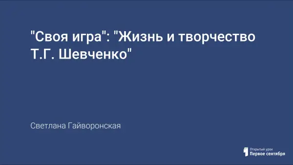 Сценарий интеллектуальной игры по творчеству Тараса Шевченко разработан в упрощенной форме телевизионной передачи «Своя игра». Тему участники узнают за неделю до соревнования. Создаются две команды с минимальным числом игроков 5 человек. Командам предлагается выбрать из категорий «Факты», «Бессмертные творения», «Оренбуржье», «Художник» вопросы разной сложности. Подробные ответы учитель использует в качестве комментария к высказываниям команд-участников.