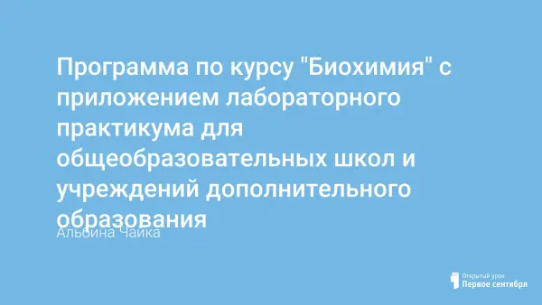 Предложена программа по курсу "Биохимия" и методическое приложение к ней, которая способствует углублению и расширению знаний по химии и биологии, совершенствованию навыков работы с химическим оборудованием и физическими приборами, закрепляет умение наблюдать, анализировать, обобщать, ставить опыты, проводить эксперименты, соблюдая правила техники безопасности, работы со справочной и научной литературой.
