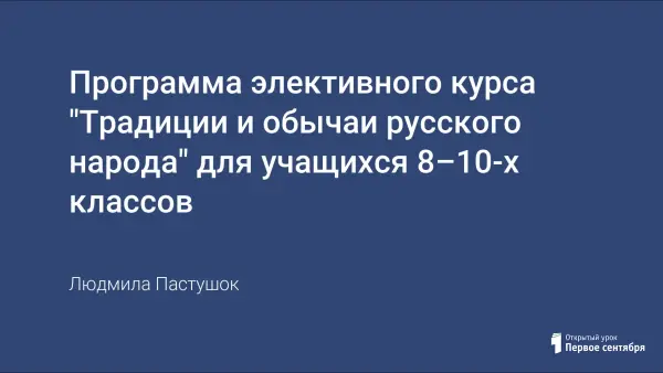 Цель элективного курса – сформировать у школьников систему нравственных качеств путем изучения русских культурных традиций. Особенности курса – его интегрированный характер. Он вобрал в себя сведения исторические, географические, этнографические, по филологии, литературе, музыке, изобразительному искусству. Занятия создают условия для разностороннего духовного, нравственного, эстетического развития учащихся.