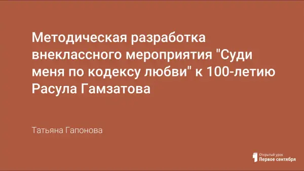 Тема патриотизма, любви к матери, уважения к женщине, бережного отношения к памяти народа – те вопросы, которые раскрывает в своём творчестве Расул Гамзатович Гамзатов. На уроках литературы изучению художественных произведений народов России уделяется мало времени, поэтому внеклассная работа помогает преодолеть дефицит учебного времени, в неформальной обстановке познакомиться с биографией и творчеством этих писателей и поэтов. Внеклассное мероприятие «Суди меня по кодексу любви» приурочено к 100-летию Расула Гамзатова и проведено в неделю словесности. Представляет собой литературно-музыкальную композицию, основанную на биографии поэта с использованием его произведений. Методическая разработка внеклассного мероприятия предназначена для использования учителями средней школы и педагогами дополнительного образования для подготовки и проведения внеклассного мероприятия в форме литературно-музыкальной гостиной. Рассчитана на обучающихся 7–11-х классов. Направлена на формирование интереса обучающихся к изучению литературы народов России, воспитание эстетического восприятия мира через поэзию и патриотизма. Рекомендовано для проведения в неделю словесности.