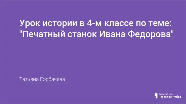 В данной статье представлен урок истории в 4-м классе по теме: «Печатный станок Ивана Фёдорова». Целью урока является знакомство с историей развития книгопечатания на Руси и первопечатником Иваном Федоровым, а также воспитание уважения и любви к книгам, труду людей их создающих.