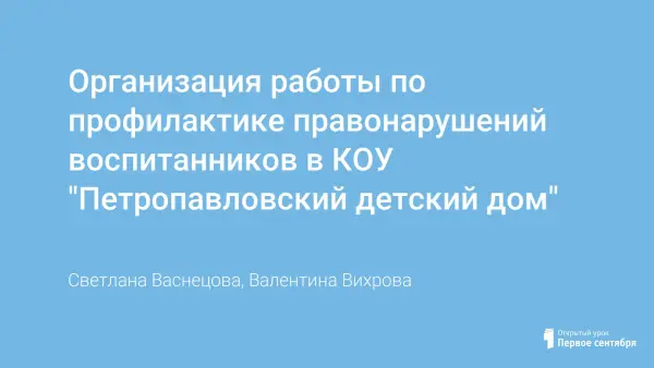 Проблема беспризорности и бродяжничества несовершеннолетних особенно актуальна для воспитанников детских домов. Поэтому ранняя профилактика правонарушений среди несовершеннолетних определена одним из основных направлений деятельности педагогического коллектива КОУ «Петропавловский детский дом». В статье описаны формы и методы работы с воспитанниками по профилактике правонарушений.