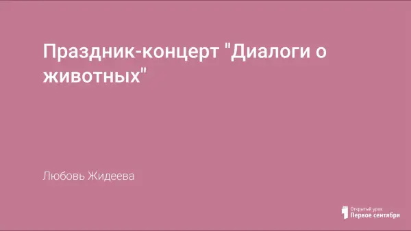 Сценарий осеннего музыкального праздника разработан с учетом психологических и возрастных особенностей младшего школьного возраста, в форме телепередачи «Диалоги о животных». Праздник дает возможность не только более глубоко познакомить детей с музыкальными и литературно-художественными произведениями, но и помогает детям раскрыть их музыкальные и творческие способности, родителям – увидеть своего ребенка в неожиданном ракурсе, разнообразить и эмоционально обогатить общение с детьми.