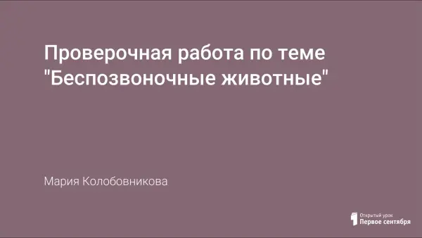 Тест может быть использован для закрепления знаний по теме, для проверки знаний по теме, для самостоятельной работы обучающихся. Ключевые слова: беспозвоночные, кишечнополостные, плоские черви, круглые черви, кольчатые черви, моллюски, членистоногие, ракообразные, паукообразные, насекомые, развитие с полным и неполным превращением.
