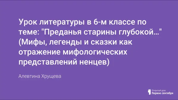 Урок внеклассного чтения в 6-м классе. В основе данного урока - работа групп учащихся, получивших разные по сложности задания. Основная задача урока - рассмотреть мифологические представления ненцев в контексте мировой мифологии.