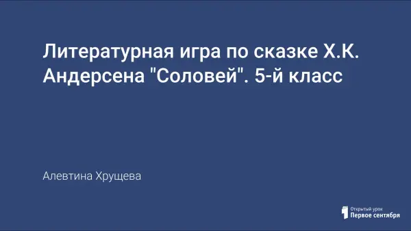 В системе уроков по изучению сказки Х.К.Андерсена "Соловей" этот урок - обобщающий. Внимание учеников акцентируется на общечеловеческом значении произведения. Не менее важной задачей является активизация речевой деятельности пятиклассников. Для этого на уроке в системе используются разнообразные методы и приёмы стимуляции творческой активности учеников. Каждый этап урока методически обоснован и преследует конкретные образовательные и развивающие цели.