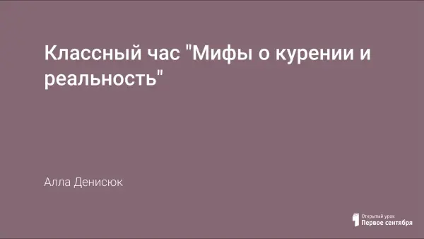 Цели классного часа: познакомить учащихся с реальными и мифическими представлениями о курении, научить различать их, целенаправленно формировать осознанное отрицательное отношение к курению, помочь детям развивать в себе привычку к здоровому и творческому образу жизни, на конкретных примерах доказать пагубное влияние на организм человека никотина. Классный час проводится в кабинете информатики, учащиеся создают и защищают проекты, в которых должны развенчать мифы о курении.
