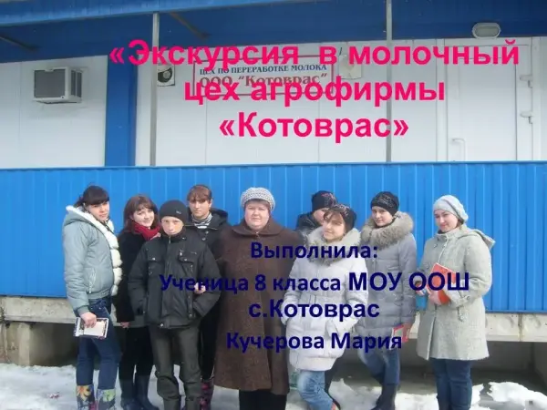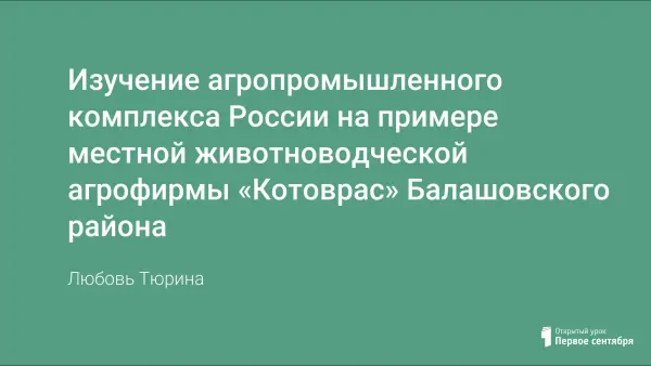 Цель занятия: обмен опытом с коллегами при использовании методики проведения экскурсии на местное предприятие ООО «Котоврас», которая применялась и успешно внедрялась в образовательный процесс при изучении темы «Агропромышленный комплекс России: животноводство» в 9-м классе.