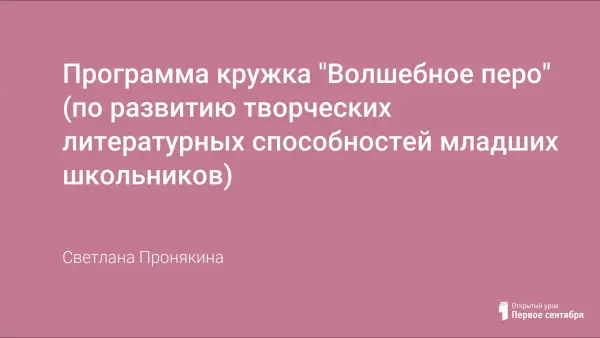 Программа кружка «Волшебное перо» по развитию литературных способностей младших школьников, которая включает в себя знакомство с произведениями от истоков устного народного творчества до современной литературы; знакомство со структурами рассказа, сказки, стихотворения; типы текстов. Основная цель «Программы» – выработка умений создавать свои произведения. Тематическое планирование занятий рассчитано на 96 часов (2–4-е классы) из расчета 1 раз в неделю.