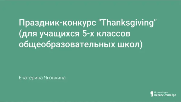 Сценарий праздника разработан в ходе педагогической практики "Внеклассная работа по предмету" для студентов, обучающихся в педагогическом колледже по специальности "Иностранный язык", реализован на базе общеобразовательных школ города. Праздник направлен на знакомство учащихся с одним из национальных американских праздников, способствует закреплению знания английского алфавита, цветов и лексических единиц по теме "Food".